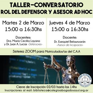 Taller-Conversatorio “Rol del Defensor y Asesor Ad Hoc”Constará de dos encuentros para matriculados y matriculadas del C.A.A, el martes 2 y jueves 4 de marzo, de 15 a 13.60hs, vía Sistema Zoom. Inscripciones hasta el 2/03 a las 14hs vía mail: biblioteca@colegioabogadosazul.org.ar LEER MÁS |