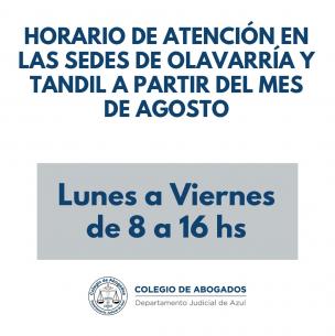 Nuevo horario de atención en las sedes de Olavarría y TandilInformamos que, a partir del mes de agosto la atención será de lunes a viernes de 8 a 16hs. La sede de Azul continuará con el horario habitual de 8 a 19hs. LEER MÁS |
