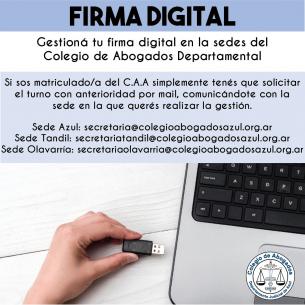Gestioná tu firma digital en la sedes del Colegio de Abogados DepartamentalSi sos matriculado/a del C.A.A, solicitá tu turno con anterioridad por mail, comunicándote con la sede en la que querés realizar la gestión. LEER MÁS |