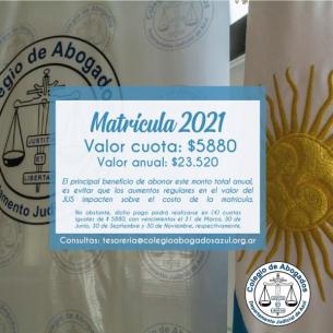 Valor de la matrícula anualEl valor de la matrícula anual 2021 se calcula en base al 90 % de 8 Jus arancelarios, tomándose el Jus Arancelario Ley Nº 14.967 de $3.092; por lo que el valor de la cuota es de $5.880 y el de la matrícula anual de $23.520 LEER MÁS |