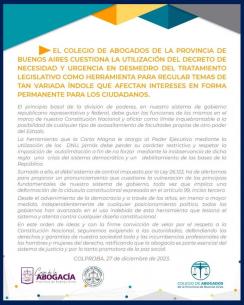 Comunicado de COLPROBA ante el DNU presentado por el Ejecutivo NacionalCOLPROBA cuestiona la utilización del Decreto de Necesidad y Urgencia en desmedro del tratamiento legislativo como herramienta para regular temas de tan variada índole que afectan intereses en forma permanente para los ciudadanos. LEER MÁS |