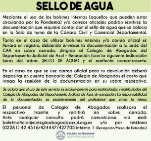 Sello de AguaMediante el uso de los bolsines internos (aquellos que pueden estar circulando por la Pandemia) y/o correos oficiales podrán remitirse la documentación que requiere contar con el sello de agua que se coloca en la Sala de turno de la Cámara Civil y Comercial Departamental. LEER MÁS |