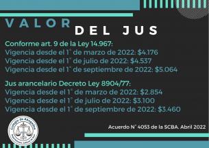 Valor vigente del JUSInformamos los montos establecidos mediante el Acuerdo N° 4053 de la SCBA. LEER MÁS |