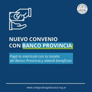 Pagá la matrícula con tu tarjeta del Banco Provincia y obtené beneficiosEl 6 de enero del corriente, el Colegio de Abogados Departamental firmó un convenio con la entidad bancaria que incluye importantes beneficios para quienes abonen la matrícula con tarjetas de Crédito Visa y MasterCard del Banco Provincia. LEER MÁS |