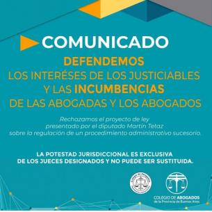 Defendemos los intereses de los justiciables y las incumbencias de las/os abogadosFrente al proyecto de ley presentado recientemente por el Diputado Martín Tetaz identificado con el número 1762-D-2023 sobre la regulación de un procedimiento administrativo sucesorio, el Colegio de Abogados de la Provincia de Buenos Aires comunica su absoluto rechazo respecto al proyecto, como así también, a cualquier reforma que desplace la función judicial en favor de un organismo dependiente del Poder Ejecutivo. LEER MÁS |