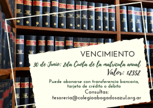 El 30 de junio venció la 2° cuota de la matrícula anualAquellas matriculadas y matriculados que aún no hayan abonado la cuota deben hacerlo lo antes posible. El valor de la misma es de $2352 (dos mil trescientos cincuenta y dos) equivalente al 80% de 2 JUS arancelarios. Consultas: tesoreria@colegioabogadosazul.org.ar LEER MÁS |