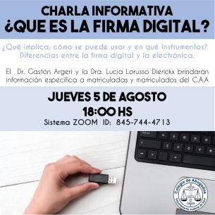 Charla informativa: ¿Qué es la firma digital?El Dr. Gastón Argeri y la Dra. Lucía Lorousso Dierickx brindarán información específica a matriculadas y matriculados del C.A.A, respecto de ¿Qué implica, cómo se puede usar y en qué instrumentos? Explicando además, las diferencias entre la firma digital y la electrónica. LEER MÁS |