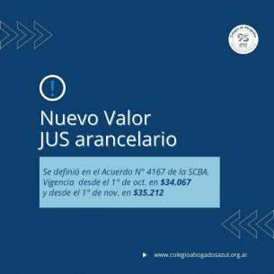 Valor del JUS: Actualización aplicable a octubre y noviembreLa SCBA estableció la readecuación del valor del Jus desde el 1º de octubre y 1º de noviembre de 2024 como así también del valor del Jus arancelario decreto-ley 8904/77 (Acuerdo Nº 4167, Arts. 1º y 2º). LEER MÁS |