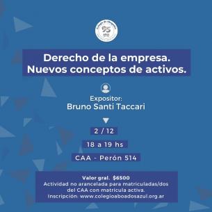 Nueva actividad sobre derechos de la empresa y nuevos conceptos de activosEl próximo 2 de diciembre Bruno Santi Taccari llevará adelante una charla vinculada a las temáticas mencionadas. La actividad se realizará en la sede del Colegio, en Av. Perón 514, a las 18 hs. LEER MÁS |