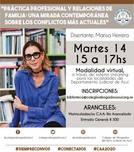 La Dra. Marisa Herrera, destacada especialista en Derecho de Familia, disertará el martes 14/04 de 15 a 17hs por sistema streaming para que matriculadas y matriculados de todas las localidades del Departamento Judicial puedan asistir en forma virtual. Inscripciones: biblioteca@colegioabogadosazul.org.ar