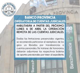 Como resultado de las intensas gestiones realizadas por los Presidentes de los Colegios de Abogados, las autoridades del Banco de la Provincia de Buenos Aires habilitarán a partir del próximo lunes 6 de abril la operación remota de las cuentas judiciales.