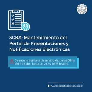 Mantenimiento del Portal de Presentaciones y Notificaciones ElectrónicasInformamos a matriculados/as del Colegio que la subsecretaría de tecnología informática estará realizando tareas de mantenimiento en dicho portal en los próximos días, por lo tanto, se encontrará fuera de servicio desde las 00 hs del 6 de abril hasta las 23 hs del 9 de abril. LEER MÁS |