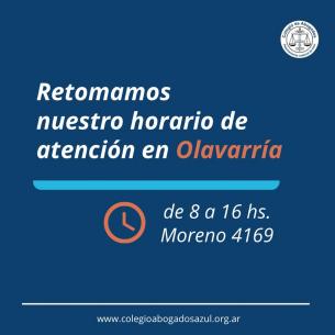 Horario de atención en la sub sede OlavarríaInformamos a matriculados y matriculadas del Colegio de Abogados Departamental que la sub sede Olavarría estará a disposición de los profesionales desde el lunes en su horario habitual de 8 a 16 hs. LEER MÁS |