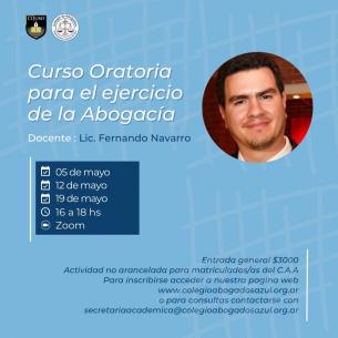 Curso "Oratoria para el ejercicio de la abogacía"El C.A.A. junto con la Fundación Cijuso han organizado un curso de oratoria que busca trabajar sobre la misma en el ejercicio de la abogacía. Comenzará el 5 de mayo a las 16 hs y se realizará en modalidad virtual a través de la plataforma de videoconferencias Zoom. LEER MÁS |