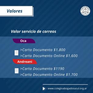Valores vigentes para el envío de Carta DocumentoMatriculadas y matriculados tienen a disposición en Mesa de Entradas del Colegio de Abogados Departamental, los servicios de correo OCA o Andreani, de acuerdo a su preferencia. LEER MÁS |