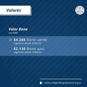 Valores Bono Ley 8480De acuerdo a lo dispuesto por el Consejo Superior, se establecen los siguientes valores para los bonos ley 8480 a partir del lunes 3 de abril: Bono Verde $ 4.260 y Bono Azul $ 2.130. LEER MÁS |