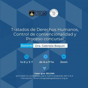 Capacitación sobre tratados de DDHH, control de convencionalidad y proceso concursalLos días 14 de junio y 5 de julio a las 14 hs, la Dra. Gabriela Boquin expondrá frente a las y los matriculados del Colegio sobre la temática mencionada. LEER MÁS |