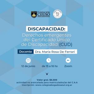 Charla informativa sobre Derechos Emergentes del Certificado Único de Discapacidad (CUD)Estará a cargo la Dra. María Rosa de Ferrari y se realizará el 12 de junio a las 15 horas en modalidad virtual. LEER MÁS |