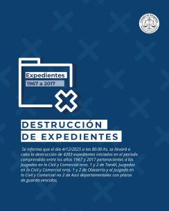 Nueva jornada de destrucción de expedientes en el Departamento Judicial de AzulEl próximo 4 de diciembre a las 8 hs, se llevará a cabo una nueva jornada de destrucción de expedientes. La medida se realiza conforme a lo dispuesto por la Resolución N.º 2641/2025 de la SCBA, y alcanzará un total de 4203 expedientes iniciados entre los años 1967 y 2017, pertenecientes a los Juzgados en lo Civil y Comercial N.º 1 y 2 de Tandil, N.º 1 y 2 de Olavarría, y N.º 2 de Azul, todos ellos con plazos de guarda vencidos. LEER MÁS |