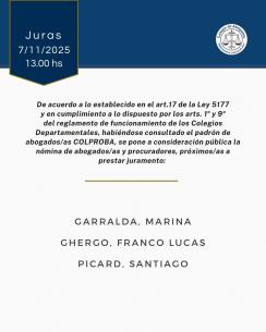 Acto de Jura de nuevas matriculadas y matriculadosEl próximo viernes 7 de noviembre se realizará un nuevo acto de jura de matriculados/as en la sede de nuestro Colegio de Abogados Departamental. Desde las 13 hs las autoridades acompañarán a la nómina de profesionales que se pone a consideración pública. LEER MÁS |