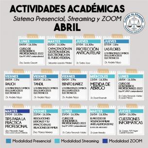 Agenda de actividades académicas de abrilCompartimos el detalle de las capacitaciones que se brindarán en forma presencial, vía streaming y zoom, durante este mes. LEER MÁS |