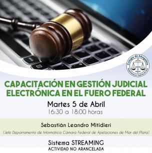 Capacitación en Gestión Judicial electrónica en el Fuero FederalEl martes 5 de abril de 16:30 a 18 hs, vía streaming, Sebastián Leandro Mitidieri, Jefe del Departamento de Informática de la Cámara Federal de Apelaciones de Mar del Plata, disertará sobre esta temática. Podés inscribirte, completando el formulario online. LEER MÁS |
