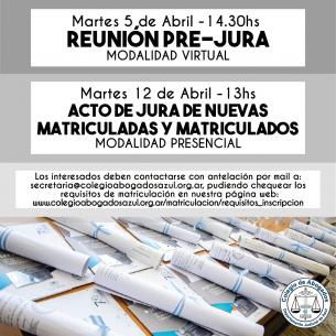 Reunión Pre-Jura y Acto de Jura de nuevas matriculadas y matriculadosEl martes 5/04 a las 14.30hs se realizará la reunión Pre-Jura, vía sistema Zoom. Las abogadas y abogados interesados en matricularse pueden chequear los requisitos de matriculación en nuestra web y deberán previamente, comunicarse con Secretaría del C.A.A. LEER MÁS |