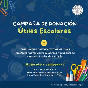 El Colegio impulsa una campaña de donación de útiles escolaresQuienes deseen colaborar con útiles escolares, deben acercarlos a la Sede de Azul o a las Subsedes de Olavarría y Tandil en el horario de 8 a 16 hs. Se recibirán útiles escolares nuevos hasta el próximo viernes 7 de marzo. LEER MÁS |