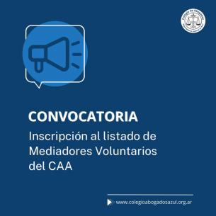 Convocatoria a inscripción al listado de mediadores voluntariosA partir de la aprobación del nuevo reglamento del Centro de Mediación Voluntaria del C.A.A., y lo dispuesto por el art. 2 del ANEXO I de la Resolución 756/2023 con fecha 24 de abril, se convoca a la Inscripción en el listado de Mediadores Voluntarios, a todos los/as Mediadores/as Prejudiciales del Departamento Judicial de Azul. LEER MÁS |
