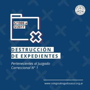 Juzgado Correccional Tandil: Destrucción de expedientesEl miércoles 30 de agosto del corriente año, se procederá a la destrucción de expedientes pertenecientes al Juzgado Correccional N° 1 con fecha de inicio de las actuaciones entre mayo de 1999 y marzo del año 2017 que se encuentran en este órgano. LEER MÁS |