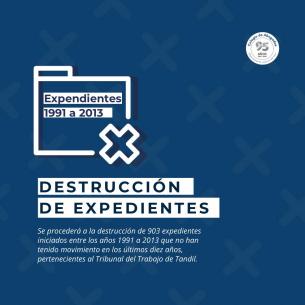 Destrucción de expedientes pertenecientes al Tribunal de Trabajo de TandilDurante la última semana del mes de noviembre se procederá a la destrucción de 903 expedientes iniciados entre los años 1991 a 2013 con plazos de guarda vencidos. LEER MÁS |