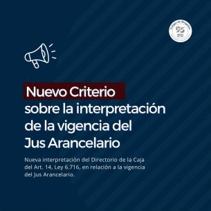 Nuevo criterio sobre la interpretación de la vigencia del Jus arancelarioEn la resolución del Directorio de la Caja de la Abogacía de los días 11 y 12 de julio se definió que el pago de aportes y contribuciones, en un día determinado, tendrá efecto cancelatorio cuando se efectúe conforme al valor del jus arancelario vigente en dicha fecha de pago. LEER MÁS |