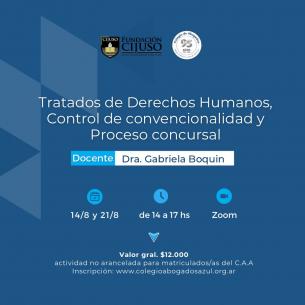 Capacitación sobre tratados de DDHH, control de convencionalidad y proceso concursalLos días 14 y 21 de agosto a las 14 hs, la Dra. Gabriela Boquin expondrá frente a las y los matriculados del Colegio sobre la temática mencionada. LEER MÁS |