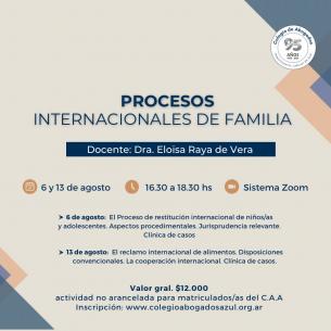 Nueva propuesta del Colegio: Capacitación sobre Procesos Internacionales de FamiliaEl próximo 6 de agosto a las 16.30 hs y en modalidad virtual, comenzará la capacitación sobre procesos internacionales de familia que estará a cargo de la Dra. Raya de Vera. LEER MÁS |