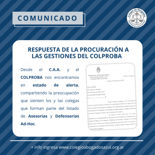 Respuesta de la Procuración a las gestiones del COLPROBA respecto de las Asesorías y Defensorías Ad-Compartimos el intercambio formal de comunicaciones efectuado entre el COLPROBA y la Procuración General de la Suprema Corte de la Provincia de Buenos Aires que fue trabajado en las reuniones presenciales del 11 y 25 de agosto pasados en la sede del Colegio de Abogados de la Provincia de Buenos Aires. LEER MÁS |