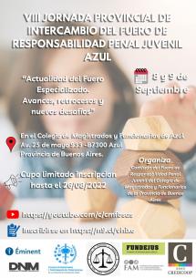 VIII Jornada Provincial de Intercambio del Fuero de Responsabilidad Penal JuvenilSe abordará la temática “Actualidad del Fuero Especializado. Avances, retrocesos y nuevos desafíos” el jueves 8 y viernes 9 de septiembre, con modalidad presencial y transmisión vía YouTube en el Colegio de Magistrados y Funcionarios de Azul (Av. 25 de mayo 933). LEER MÁS |