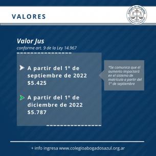 Valor de la matrículaEl valor de la matrícula anual 2022 se calcula en base al 90 % de 8 Jus arancelarios, tomándose el Jus Arancelario Ley Nº 14.967 (vigente desde el 1º de septiembre) ; por lo que el valor de cada cuota es de $9.764 mientras que el monto de la matrícula anual de $39.056.- LEER MÁS |