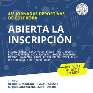Participá de las 45° Jornadas Deportivas de COLPROBASumate a nuestro equipo para representar al C.A.A del 30/11/2022 al 03/12/2022 en Mar del Plata. Confirmá tu participación completando el formulario online LEER MÁS |
