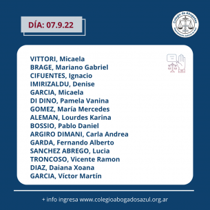 Acto de Jura de nuevas matriculadas y matriculadosEl próximo miércoles 7 de septiembre a las 13hs, con modalidad presencial en la sede de Azul (Av. Perón 514) y transmisión vía YouTube; las autoridades del Colegio de Abogados Departamental tomarán juramento a las abogadas y abogados cuya nómina ponemos en consideración pública... LEER MÁS |