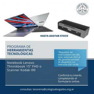 Programa de Acceso a Herramientas Tecnológicas, hasta agotar stockMatriculadas y matriculados del C.A.A interesadas/os pueden renovar su computadora y/o digitalizador, en 12 cuotas fijas y en pesos. LEER MÁS |