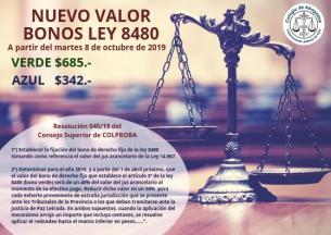 Con motivo del nuevo valor del jus arancelario fijado en $ 1.716 (SCJBA – Acuerdo Nº 3953, del 2/10/2019), y atento a lo resuelto oportunamente por el Consejo Superior con fecha 21 de marzo del corriente año (resolución número 045/19), se establecen los siguientes importes para los bonos ley 8480, a partir del martes 8 de octubre de 2019.