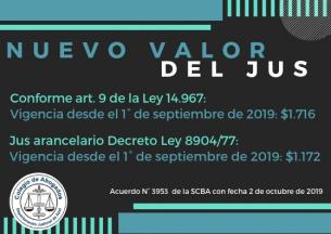 Informamos los valores establecidos mediante el Acuerdo 3953 de la Suprema Corte de Justicia de la provincia de Buenos Aires, con fecha 2 de octubre de 2019.