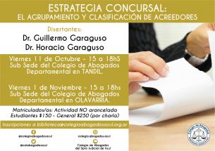Los Dres. Guillermo Garaguso y Horacio Garaguso disertarán sobre esta temática, el 11 de octubre en la Subsede de Colegio Departamental en Tandil y el 1 de noviembre en la Subsede de Olavarría, en ambas oportunidades de 15 a 18hs. Inscripciones por mail: biblioteca@colegioabogadosazul.org.ar
