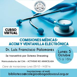 Charla: “Comisiones Médicas: ACOM y ventanilla electrónica”El Dr. Luis Francisco Palomares disertará sobre esta temática el lunes 5/10 de 15 a 16 hs, vía streaming. Esta actividad es NO ARANCELADA para matriculados/as del C.A.A Los interesados deben inscribirse antes del 5/10 a las 14 hs, vía mail: biblioteca@colegioabogadosazul.org.ar LEER MÁS |