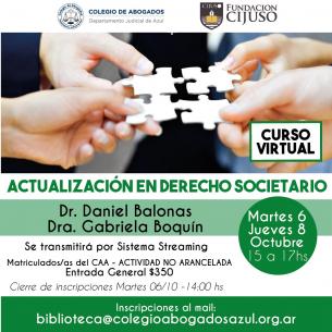 Charla: “Actualización en Derecho Societario”Durante dos encuentros vía streaming, el martes 6 y el jueves 8/10 de 15 a 17hs, la Dra. Gabriela Boquín y el Dr. Daniel Balonas abordarán esta temática con un amplio temario. Inscripciones hasta el martes 06/10 a 14 hs por mail: biblioteca@colegioabogadosazul.org.ar LEER MÁS |