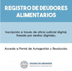 Registro de deudores alimentariosInscripción a través de oficio judicial digital, firmado por medios digitales. Acceda al portal de Autogestión y Resolución. LEER MÁS |