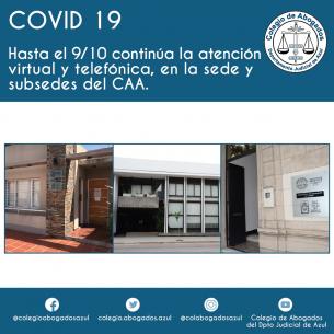COVID 19: Hasta el 9/10 continúa la atención virtual y telefónica.Atento la situación actual por el COVID-19, en varias localidades del Departamento Judicial de Azul, y con el interés de cuidar la salud de todos y seguir brindado la atención a todas las abogadas y abogados de nuestro Colegio de Abogados, se ha resuelto que la ATENCIÓN (en todas sus sedes), continuará siendo con modalidad virtual y telefónica, hasta el viernes 9/10 inclusive. Se informará oportunamente la finalización o continuidad de dicha medida. LEER MÁS |