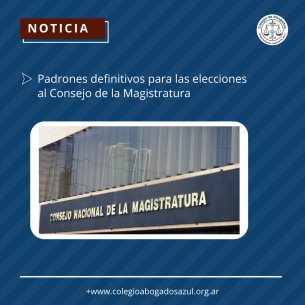 Padrones definitivos para las elecciones al Consejo de la MagistraturaInformamos a matriculadas y matriculados los padrones definitivos, para las próximas elecciones del/la representante abogado/a ante el Consejo de la Magistratura Nacional. LEER MÁS |