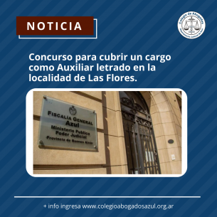 Concurso para cubrir un cargo como Auxiliar letrado en la localidad de Las Flores.La Fiscalía General del Departamento Judicial Azul, llama a concurso para cubrir un cargo de Funcionario, específicamente Auxiliar letrado para cubrir en la localidad de Las Flores. LEER MÁS |