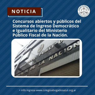 Concursos abiertos y públicos del Ministerio Público Fiscal de la Nación.El procurador general de la Nación interino Eduardo Casal convocó, mediante la Resolución ING N°28/2022, a los concursos abiertos y públicos N°166 a N°214, para cubrir vacantes del agrupamiento técnico administrativo para dependencias de varias provincias, incluyendo en Buenos Aires a la Fiscalía N°1 de Azul y la Fiscalía N°2 con asiento en Tandil; de nuestro departamento judicial. LEER MÁS |